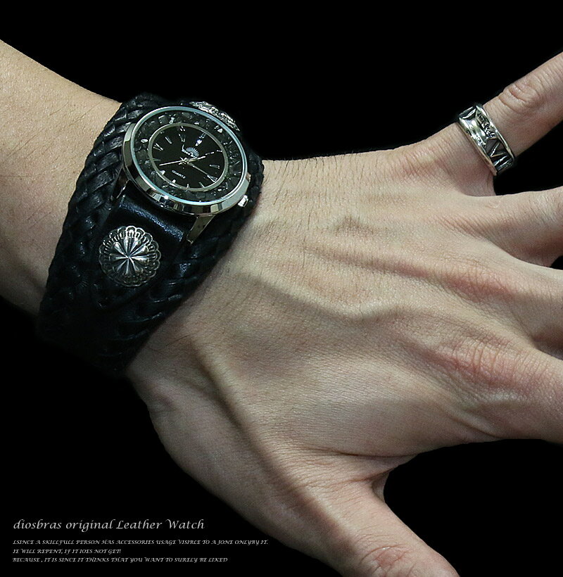 商 品 名 本革サドルレザー バイカーズウォッチ 牛革時計 インディアンフェイス Mサイズ 商品特徴 本革黒サドルレザー(牛革)を2枚張り合わせ強度をアップし、さらにハンドメイドで編みこんだ、シンプルでありながら繊細で、かつオールマイティにあわせられるデザインです。
