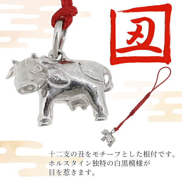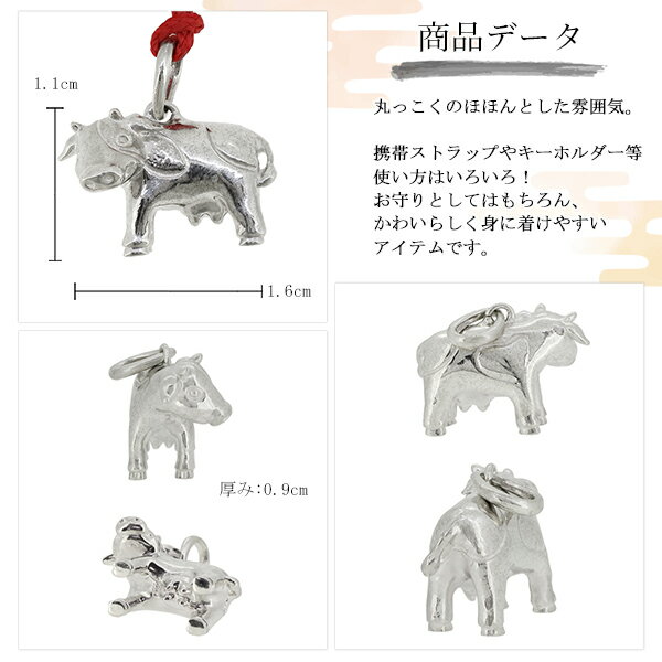 商品データ ・素材 シルバー925、根付ひも ・重量 約4.5g ・チャーム(金具含まず) 縦約1.1cm 横約1.6cm 厚み約0.9cm ・根付ひも 長さ約9cm(赤) (シルバーアクセサリー/シルバーアクセ/メンズアクセ/シルバーリング/干支/牛/うし/ウシ/無病息災/厄除け祈願/家内安全/商売繁盛) 他にも様々な携帯ストラップを多数ご用意しています。